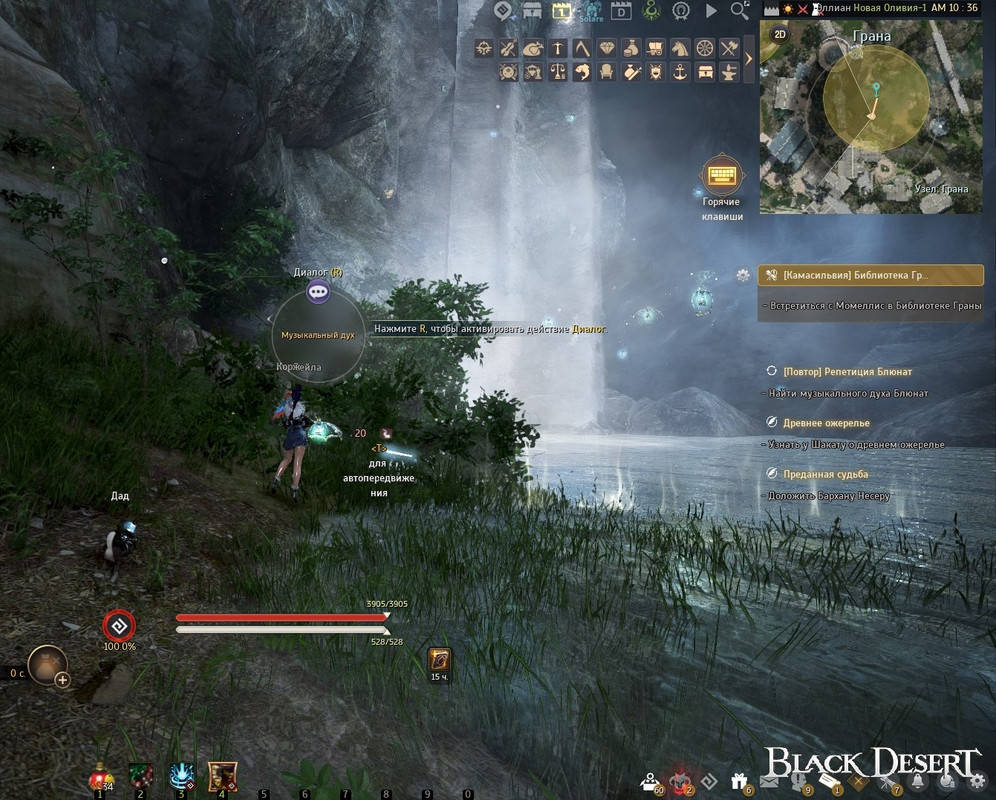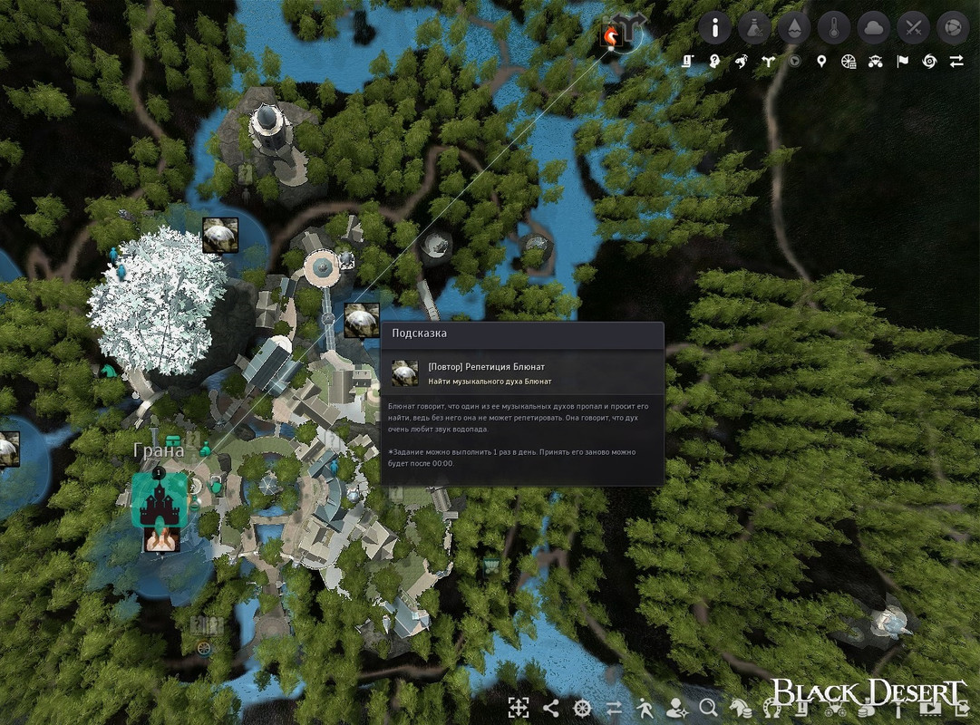 - คำอธิบาย : บลู อานาท นักดนตรีแห่งกราน่าบอกว่า หนึ่งในบรรดาเครื่องดนตรีวิญญาณที่เคยร้องเพลงร่วมกับเขาได้หายตัวไป และวิญญาณนั้นชอบเสียงของน้ำตกเป็นอย่างมาก.. จงตามหาวิญญาณนั้นแล้วกลับไปบอกบลู อานาท ※ นี่เป็นเควสรายวัน สามารถรับใหม่ได้ทุกครั้งหลังเที่ยงคืน | |