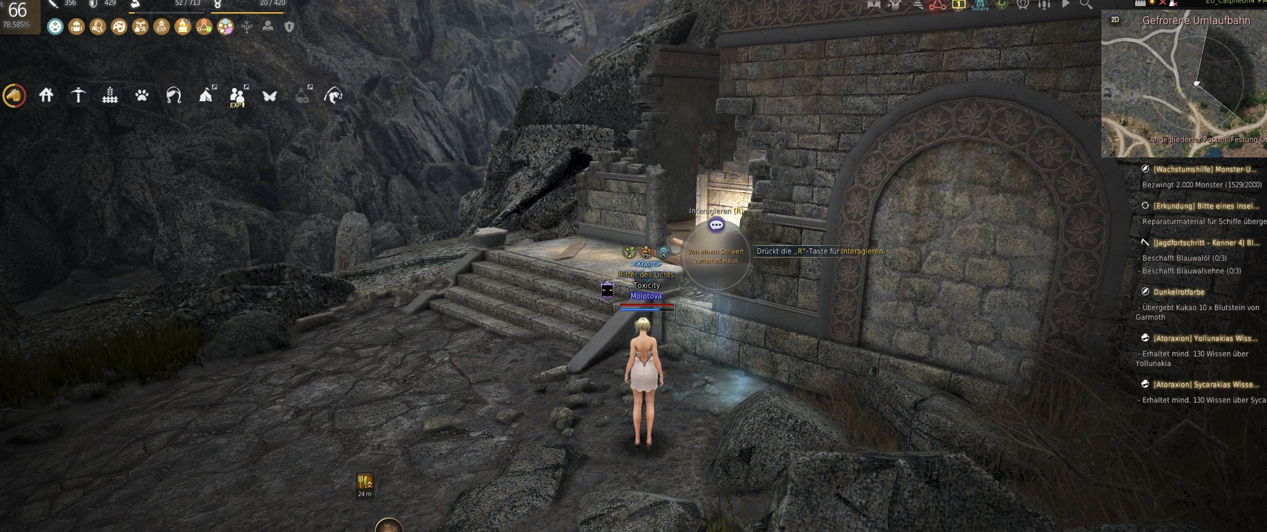 กำแพงด้านซ้ายและหลังคาถูกทำลาย จนแหลกละเอียดจากการฟันดาบอันทรงพลัง อิฐและไม้กระจัดกระจายไปทั่ว ราวกับว่ามีการระเบิดเกิดขึ้น